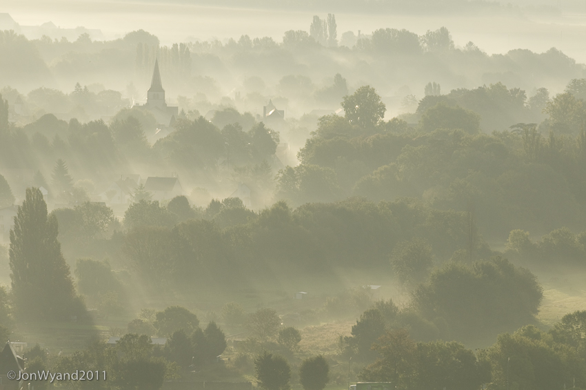 Starts misty, so the view of Ladoix is interesting. Corton Hill offers great views of Mont Blanc 150 miles away – but not today