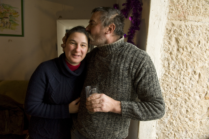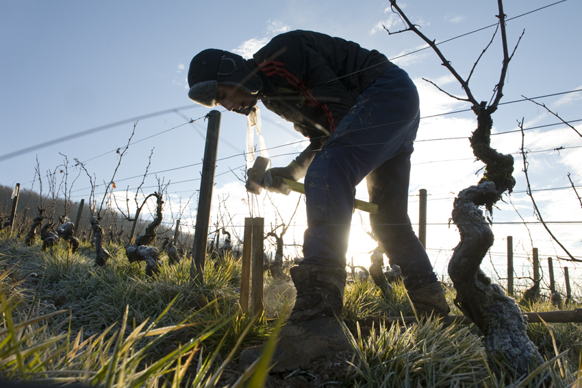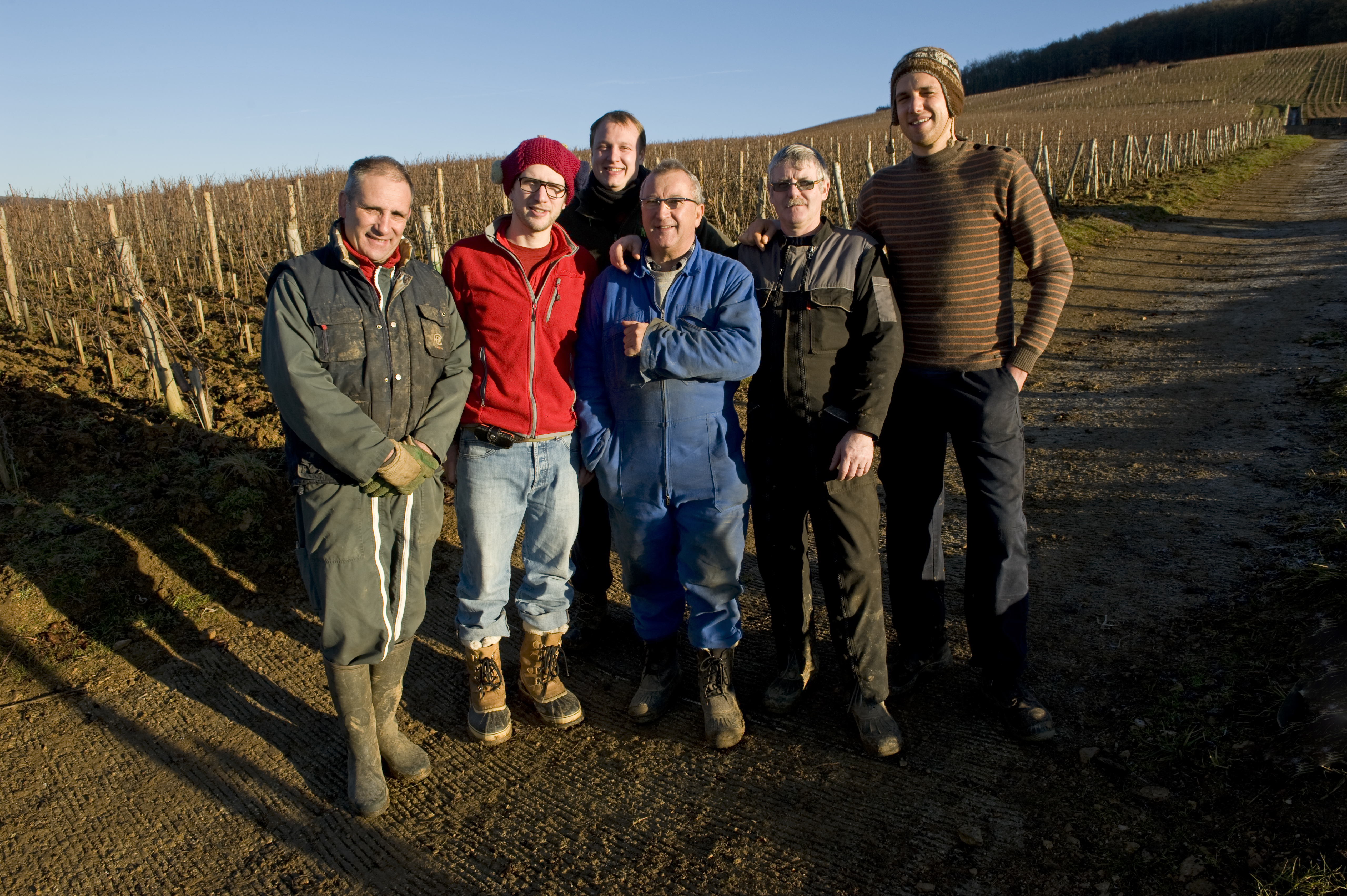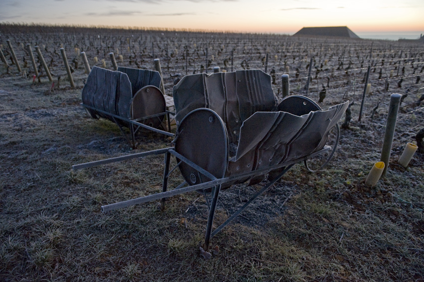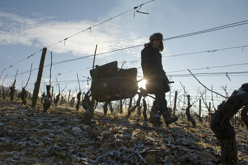 Bingo! i spot workers from Bonneau du Martray preparing to plant new vines as they dig away, bodies and breath steaming against the light. Below a couple from François André and their retreiver are feeding their brouette. Its very cold and tough work but everyone is happy to have the sun back again after a week of fog. Plenty to shoot and I just have time for a little baguette and saucisson before its time to move on.