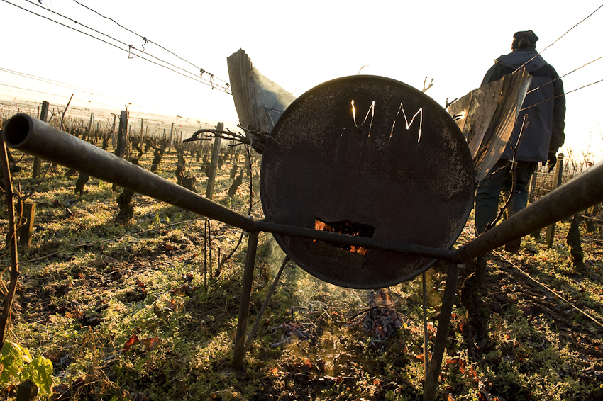 From Les Renardes the view over Ladoix is all mist and smoking chimneys, the blue haze contrasting with the warm early sunlight bouncing off the wires in Bressandes.