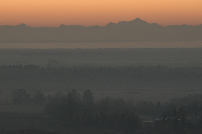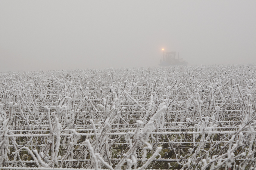 Monday morning begins with clear skies and that view of Mt Blanc again. While the extreme, windblown frost of Friday is gone the brouettes in Perrieres have a silvery edge. Cold, but not too cold for some pruning and I’m soon passed by the Bouchard tâcheron who works in Corton.