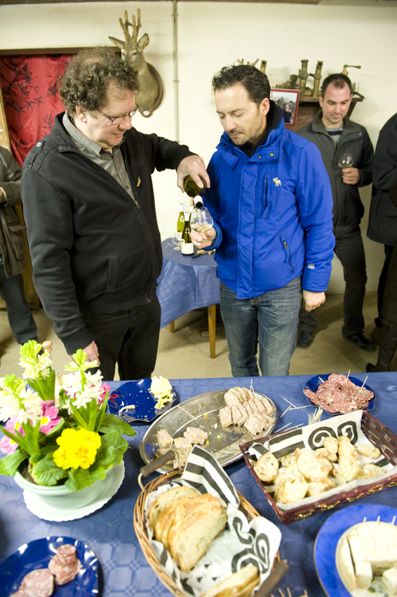 Of course I arrived in Pernand a little late due to the repositioning of large holes in the road in Aloxe. I knew where to go but there was no sign of activity until you stop and listen outside the right door ! The people you know are friendly but those who don’t know you are a little curious at the arrival of a professional camera at proceedings and its difficult to achieve an air of normality. But Domaine Marey’s wine and chevreuil pâté are a treat and its so warm with so many bodies crammed in that the camera lens has steamed up anyway!