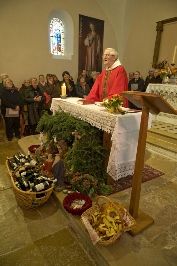 In front of the altar is the Christmas crib still and in front of that is a Burgundy basket that is being filled with bottles from the winemakers as they arrive. Something to sustain the priest through the year ahead!