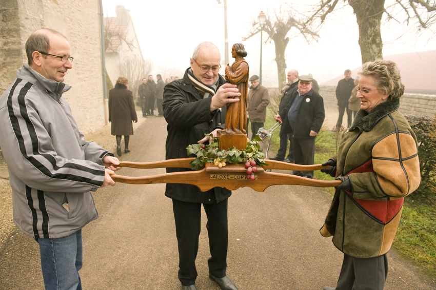 This session was followed by a change of clothes and a dash to cassecroute at Domaine Marey around 9.00 with those of Pernand going to the Mass at Echevronne at 10.30 where their statue of St Vincent, along with those of Aloxe, Pernand and Ladoix are blessed. Aperatifs at 12.30 at Domaine Rollin, the new guardians of the Pernand statue. Banquet then at the Salle des Fêtes in Aloxe around 1.30 until 7.00 ( yes really ), finishing off with a Soirée Dansant at Domaine Maratray-Dubreuil, new guardians of the statue in Ladoix, laid on in their cuverie beginning at 8.15.