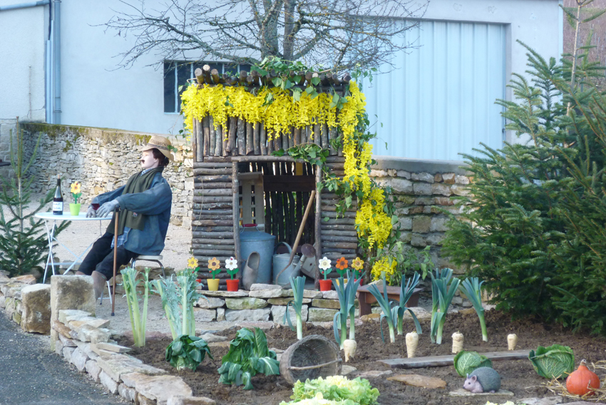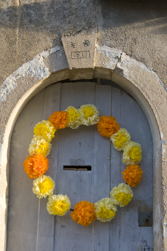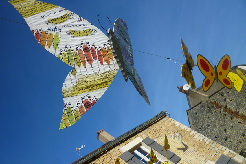 I found Olivier Lamy’s father, now retired, hanging his photographs of the vineyards and local cabottes outside his house. Hubert was, as always, a genial bear of a man with a permanent twinkle in his eyes and huge vigneron’s hands. Gerard Prudhon, the mayor, was everywhere, calmly checking this and that. Its St Aubin’s first ever hosting of the St Vincent but all was well and getting more attractive by the minute as more and more paper flowers went up. These flowers are a communal production as everyone, young and old, spends an evening once a week at the town hall throughout the preceding year creating what must be hundreds of thousands of them. The pride is visible if not tangible. Its great to see St Aubin looking so good, we just hope the rain stays away.