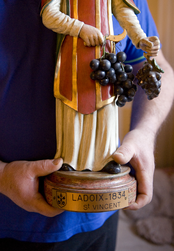 What I’m really looking forward to are the visits later on to the men who have been guardians of their village’s St Vincent Statue in Aloxe and Ladoix. Monsieur Chevalier in Aloxe has just 10 rows of Aloxe village behind his house and we had a pleasant chat and a glass of his 2010.