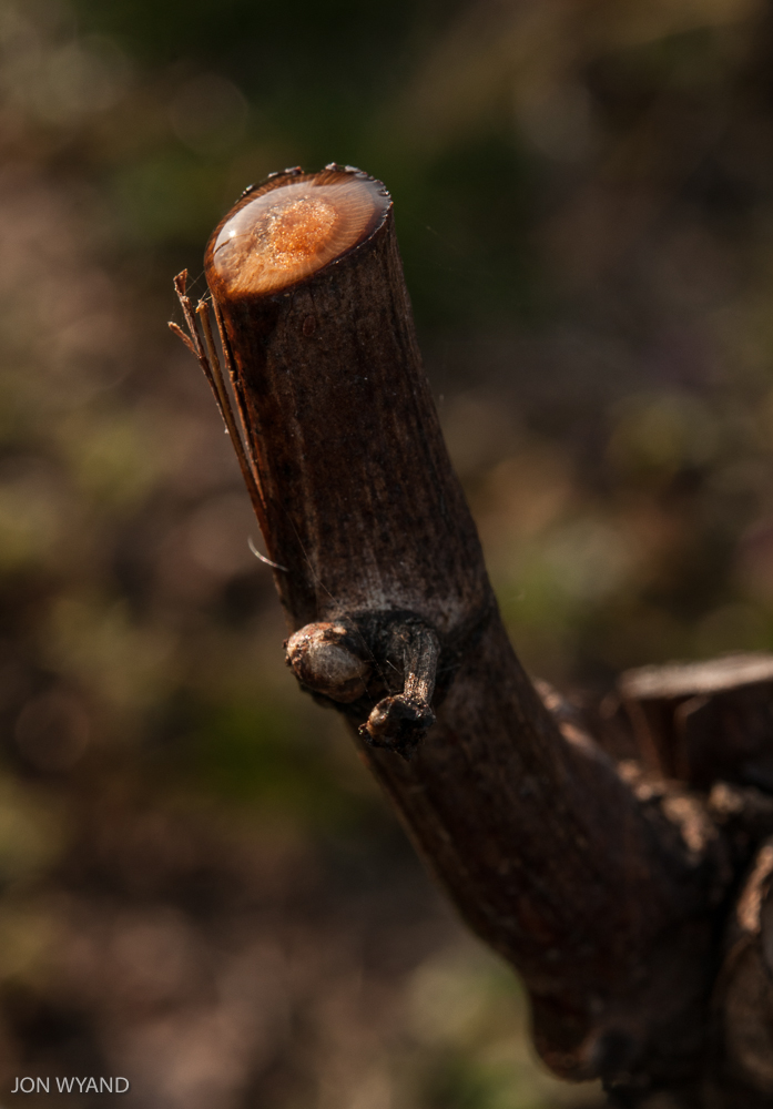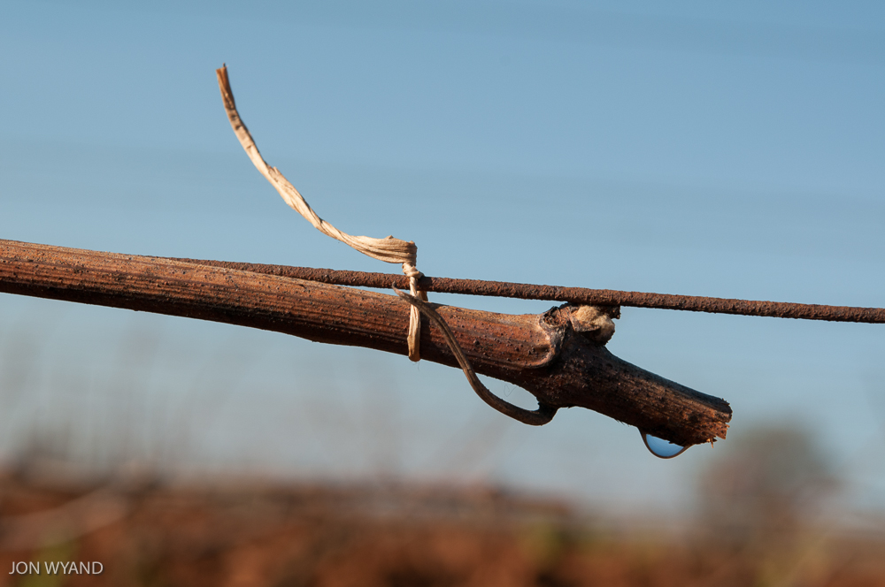 The rising sap, for example, appears as tears as it drops from the end of each pruned vine, indicating the branches are supple enough, or soon will be, to bend and tie to the wires.