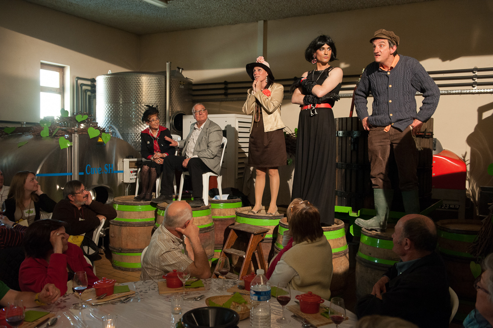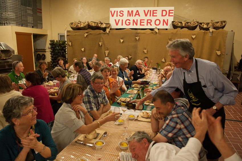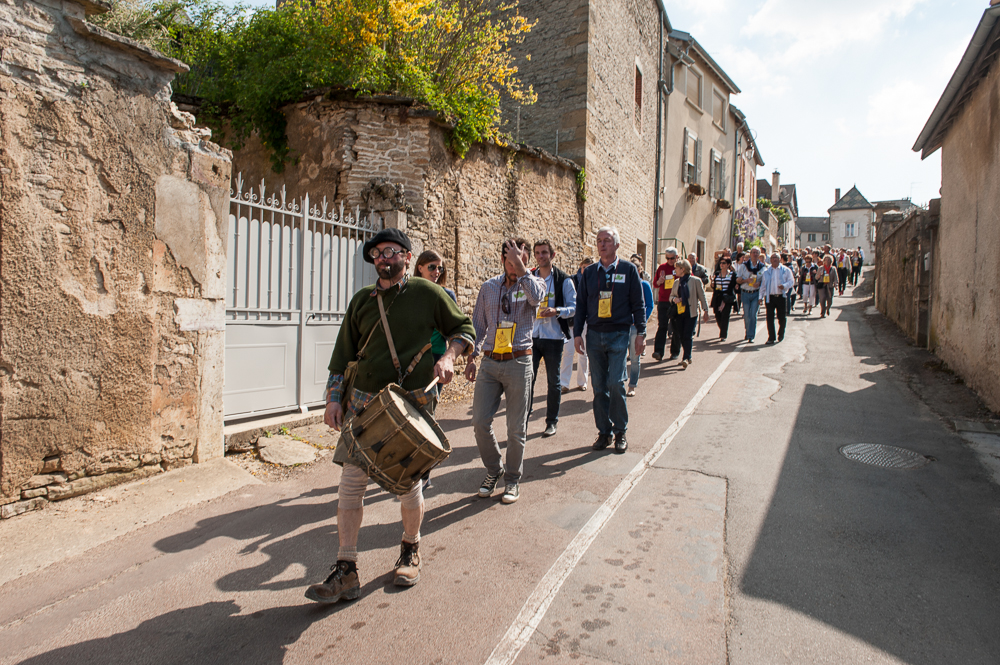 Three hundred visitors are divided in to three teams ( Chardonnay, Pinot Noir and ALigoté ) at the first winery venue where we are all presented with an Aligoté aperitif and gougeres along with our first of several theatrical entertainments before our “team” was led off by our guide Sebastien and his drum. While there is no rush each teams arrival at their next entertainment and food course ( accompanied by several wines of course ) is carefully timed as we crisscross the village from one domaine to another.