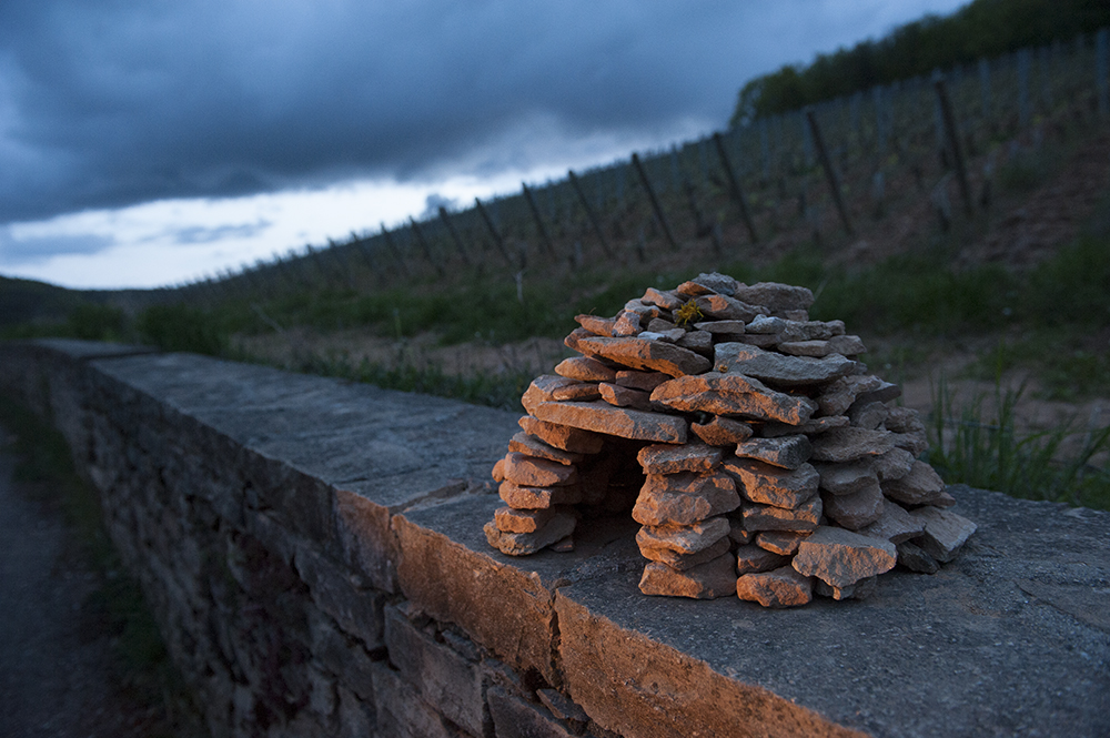 A vendangeur’s model of a cabotte still sits on a wall in Charlemagne six months later