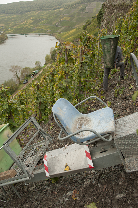 My last trip to Burgundy was followed by a quick two day assignment in the Mosel for winemaker Nik Weis of Leiwen, not far from Trier, a comfortable hop from London via Luxembourg. I had photographed him for Stephan Reinhardt’s book the Finest Wines of Germany, part of the “Finest Wines of…” series for which I was fortunate enough to be the photographer. Nik then invited me back to shoot his harvest a year later and again the following spring. I have always enjoyed the wines of the Mosel and the landscape and winemakers interest me a lot. Perhaps it could make a book…. A 200km stretch of winding river would be quite a different challenge after the intimacy of the Hill of Corton where one is constantly seeing familiar faces and always familiar with the lie of the land. Anyway here are some images from a rapid visit in mixed weather.