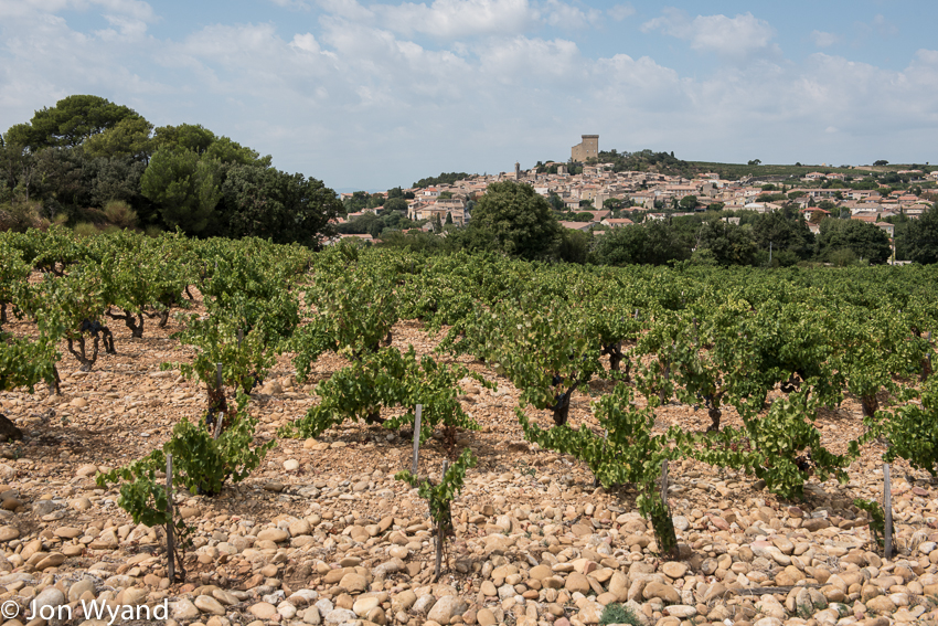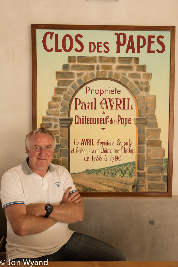 Meanwhile my route took me from Courthezon, past Beaucastel on an abortive effort to locate Rayas in the hope of gatecrashing for a recently requested portrait of Emmanuel Reynaud. No joy, he was away for a couple days. There was time for a shot of CdP from the approach from Courthezon and to eat my sandwich at Sabon before meeting winemaker Roger Negron and then calling in on Paul Avril at Clos de Papes and Isabel Ferrando at St Prefert.