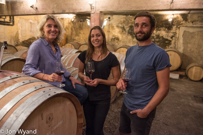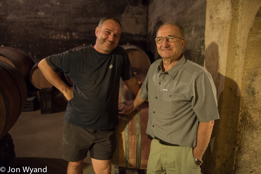 The following morning Fabrice Gripa took me on a tour of his St Joseph vineyards high on the west side of the Rhône. The steep descent by 4×4 was exhilarating even though I had done it a couple of years ago with the Gonon brothers. back at the cellars we managed to talk Fabrice’s father Bernard join us for a picture. Always good to get the generations together when possible. Grabbing a sandwich from the baker in Mauves I headed for the Sentier des Tours in Tournon for a scramble through Guigal’s terraced St Joseph vineyards for a view of the Hill of Hermitage.Then the A7 south to Chateauneuf du Pape. It was somewhat alarming to see the north bound side at a standstill for several miles around Montelimar but happily it had all gone when I returned later in the early evening.