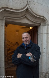 The following morning Fabrice Gripa took me on a tour of his St Joseph vineyards high on the west side of the Rhône. The steep descent by 4×4 was exhilarating even though I had done it a couple of years ago with the Gonon brothers. back at the cellars we managed to talk Fabrice’s father Bernard join us for a picture. Always good to get the generations together when possible. Grabbing a sandwich from the baker in Mauves I headed for the Sentier des Tours in Tournon for a scramble through Guigal’s terraced St Joseph vineyards for a view of the Hill of Hermitage.Then the A7 south to Chateauneuf du Pape. It was somewhat alarming to see the north bound side at a standstill for several miles around Montelimar but happily it had all gone when I returned later in the early evening.